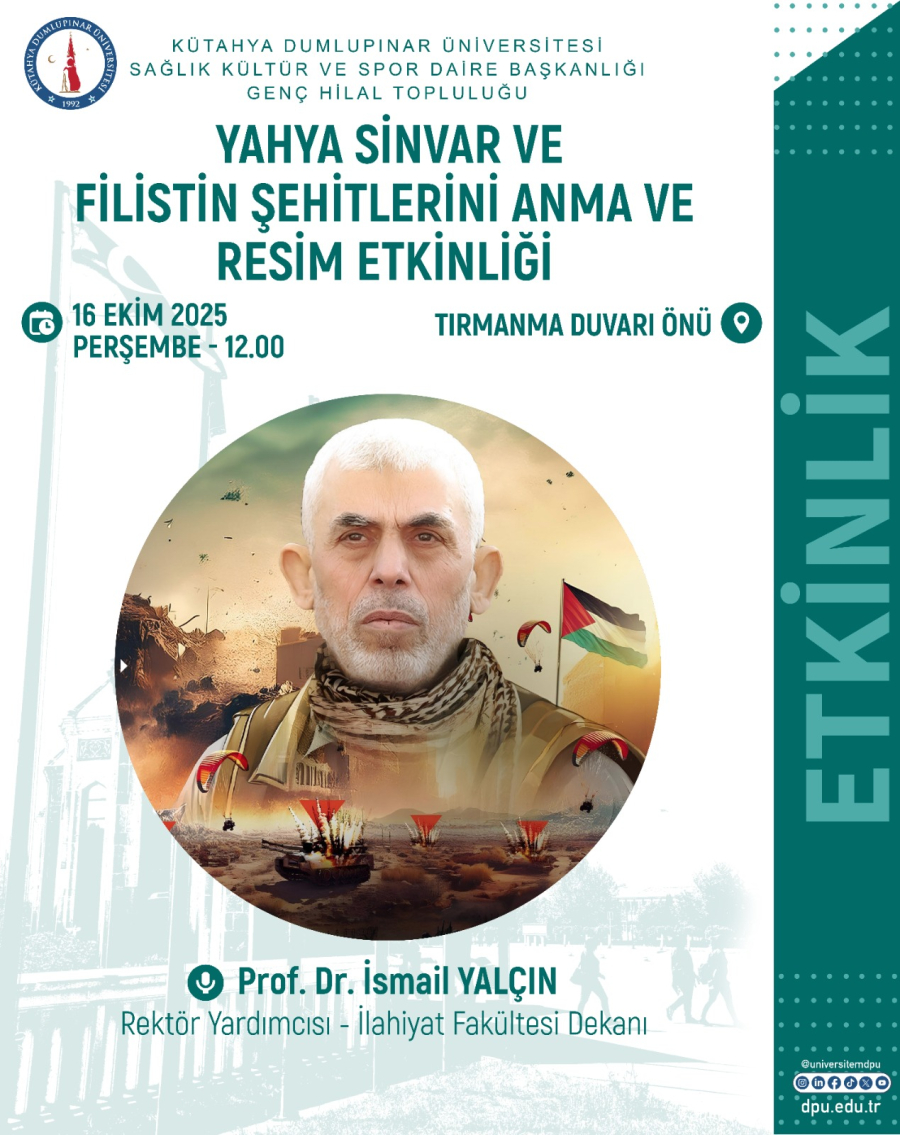 Kütahya Dumlupınar Üniversitesi Sağlık Kültür ve Spor Daire Başkanlığı bünyesinde faaliyet gösteren Genç Hilal Topluluğu tarafından düzenlenen, Prof. Dr. İsmail Yalçın’ın (Rektör Yardımcısı – İlahiyat Fakültesi Dekanı) konuşmacı olarak katılacağı “Yahya Sinvar ve Filistin Şehitlerini Anma ve Resim Etkinliği” Tırmanma Duvarı önünde gerçekleştirilecektir.